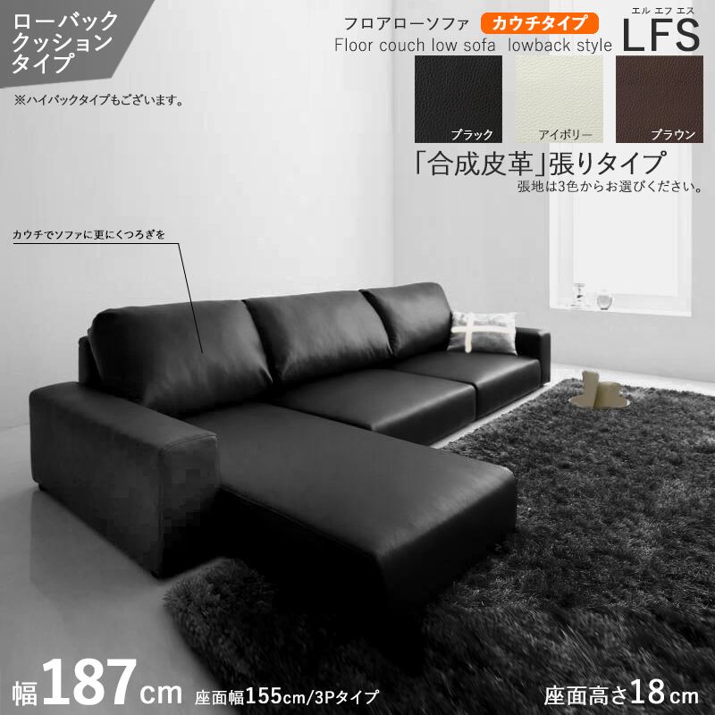 フロアソファ 【LFS/カウチソファ/3P/ローバック】 幅187cm ブラック色 / 全3色 3人掛け 合成皮革張り レザー・ウレタン シェーズロング 別売オットマンもご用意