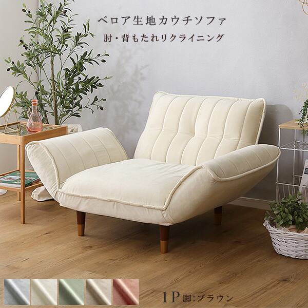 ベロアカウチソファ 1人掛け 単品(グレー&ブラウン脚)全5色 リクライニング ロータイプにも ポケットコイル くすみカラー OKBA-SHZO