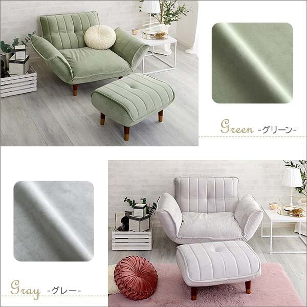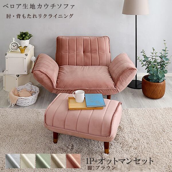 ベロアカウチソファ 1人掛け+オットマンセット (ピンク&ブラウン脚) 全5色 リクライニング ロータイプにも ポケットコイル くすみカラー OKBA-SHZO