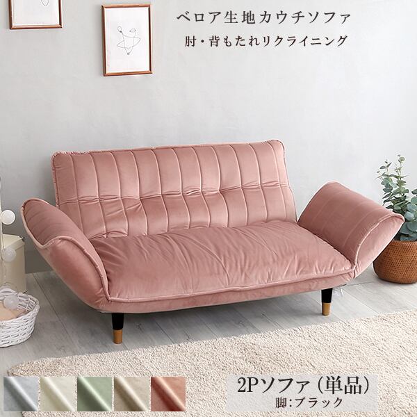ベロアカウチソファ 2人掛け単品 (ベージュ&ブラック脚) 全5色 リクライニング ロータイプにも ポケットコイル くすみカラー OKBA-SHZO