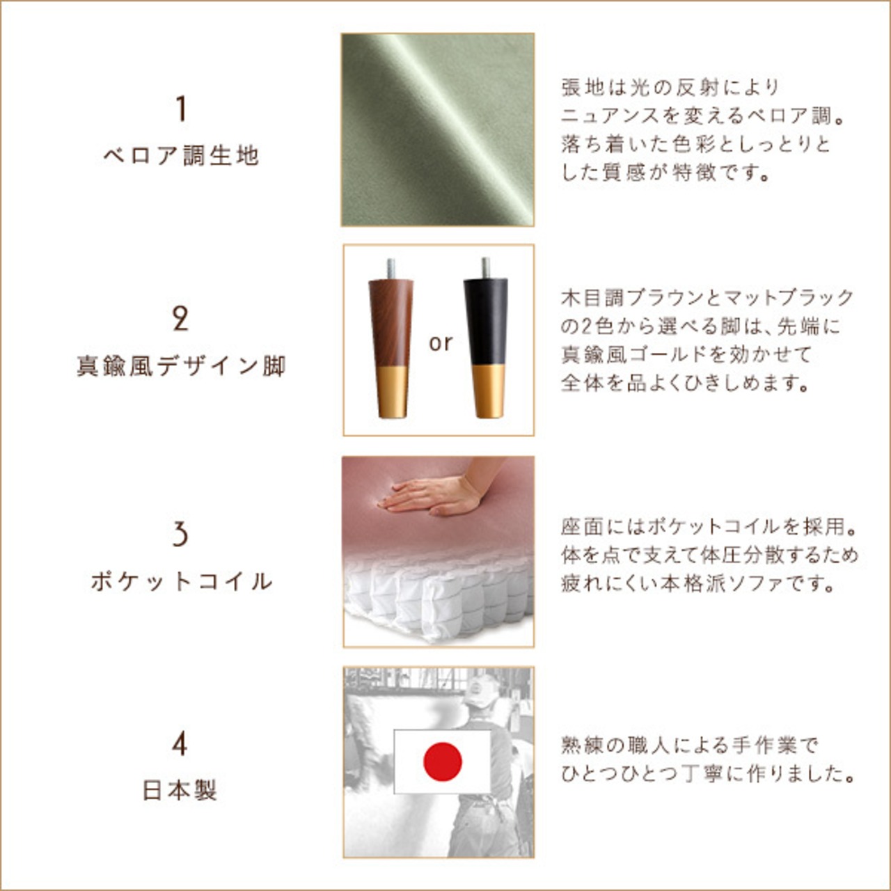 このソファは、ポケットコイルが入っているため、しっかりとした座り心地と柔らかさを兼ね備えています。快適なくつろぎ時間を提供します。さらに、耐久性も優れており、長くご利用いただけます。