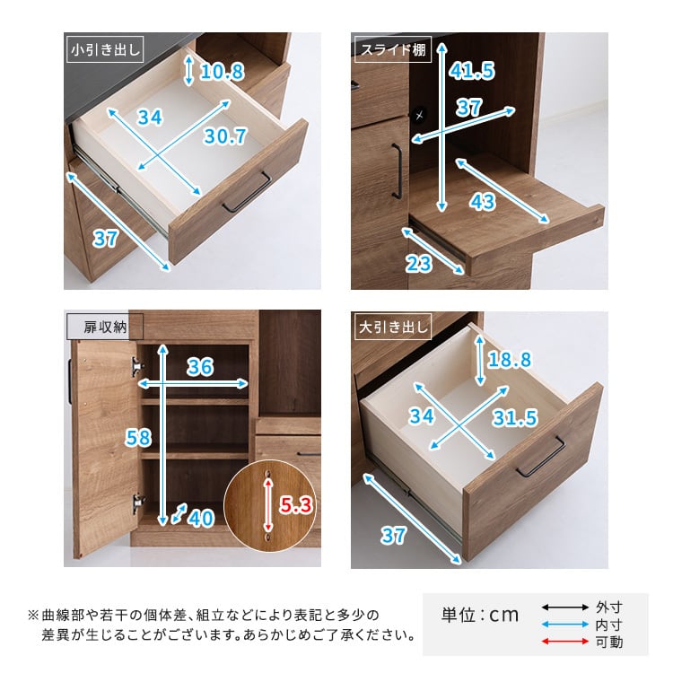 炊飯器を乗せたまま手前に引き出せるスライドテーブル、配線を背面に隠せるコード穴つき。