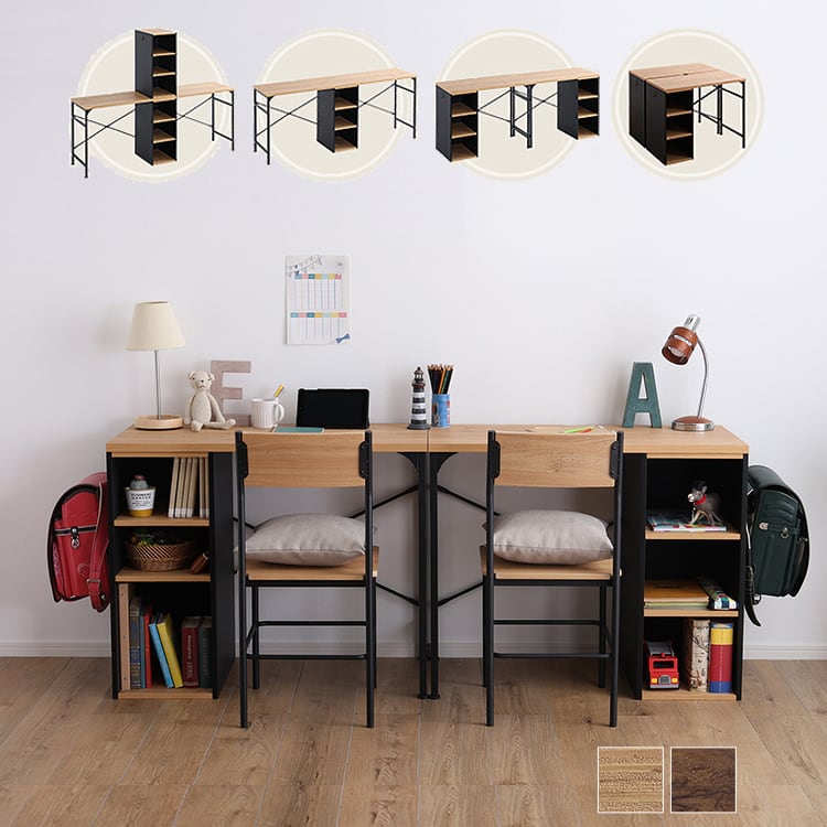 デスク 本棚セット 90cm ウォールナットブラウン色 シャビーオーク色 4つのレイアウト 木目調 ツイン 2台セット キッズ 子供部屋 兄弟