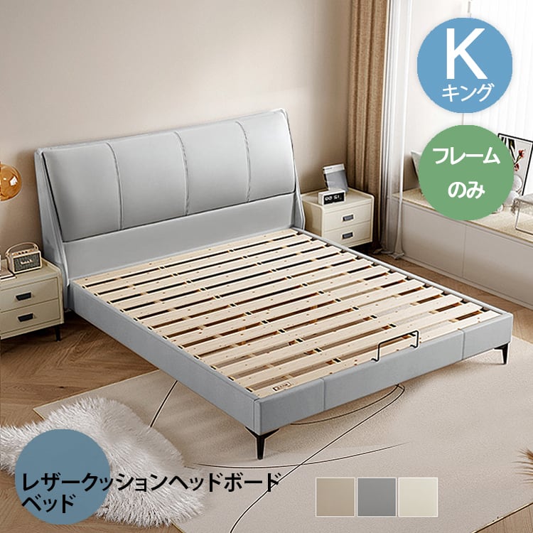ベッド キングサイズ 本革レザー 牛革張りクッションヘッドボード すのこベッド グレー色 全3色 180×200cm